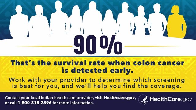 90%. That’s the survival rate when colon cancer is detected early. Health Care coverage includes cancer screenings. Enroll now. Contact your local Indian health care provider, visit Healthcare.gov, or call 1-800-318-2596 for more information. A message from the Centers for Medicare and Medicaid Se