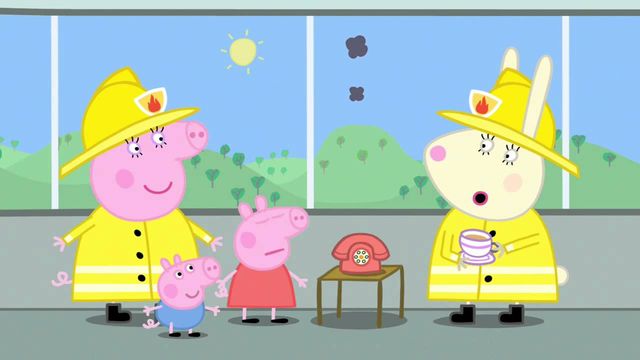 Peppa and George go with Mummy Pig to Miss Rabbit's Mummies Fire Engine Service.